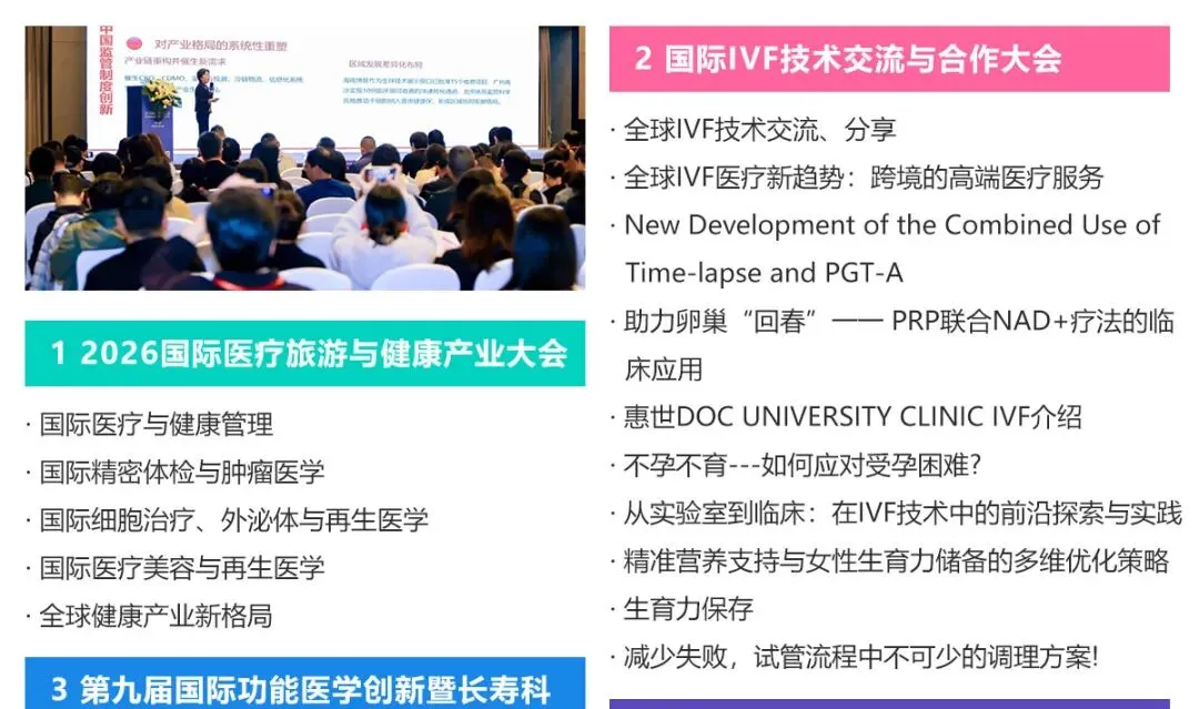 1、国际专科及综合医院:辅助生殖、重症治疗、精密体检、癌症治疗、医美整形、私立医院、外泌体、细胞治疗、干细胞与再生医学、医美整形、抗衰老、进口药品、国际疫苗