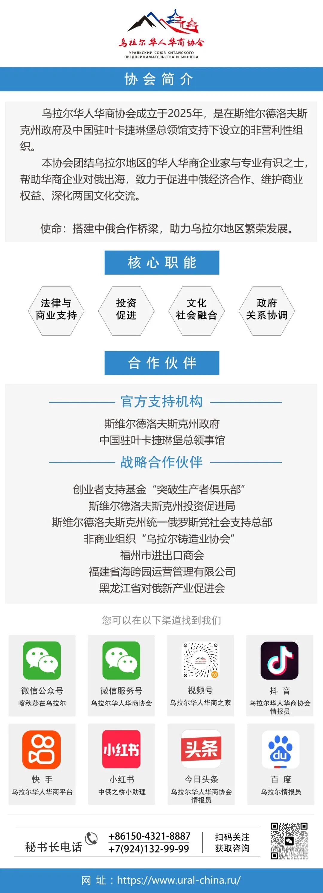 作为经中国驻叶卡捷琳堡总领馆见证成立、与俄地方政府及工商机构深度合作的华商平台,乌拉尔华人华商协会始终以侨为桥、商为脉,致力于成为中国企业出海俄罗斯的稳定器、连接器、护航者,为中俄经贸合作注入民间动力与务实活力。