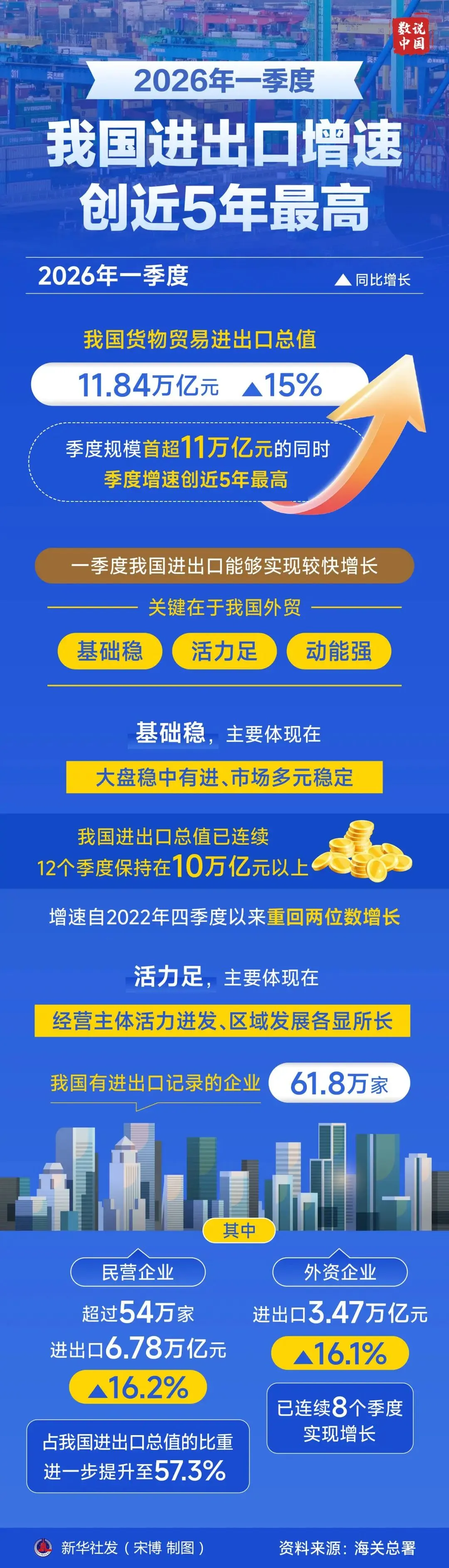- 一季度外贸创新高:进出口总值11.84万亿元,同比+15%,增速创近5年最高;外资企业进出口增16.1%,连续8季度增长 。