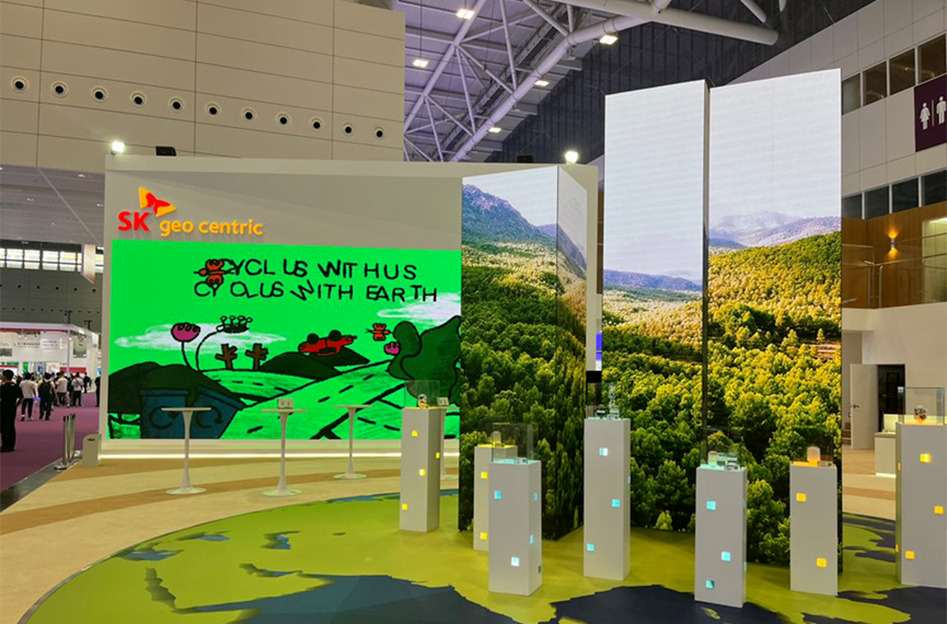 在SKGC的展位上,一组炫目的LED灯塔展示了SKGC的各种技术和产品,这些塔以废塑料的三大化学回收技术为主题,代表了“以地球为中心”和“城市油田”的概念。从废塑料再转化为原料,地球环境越来越纯净。