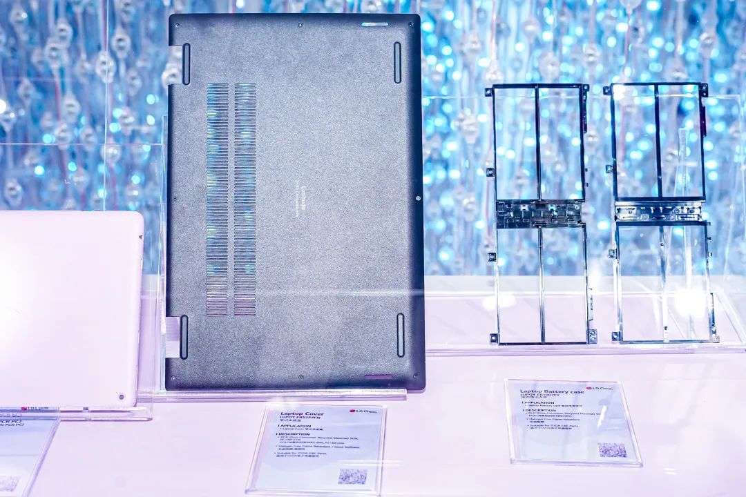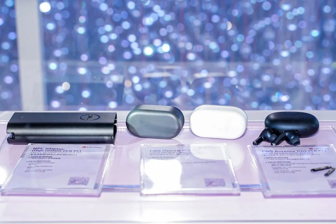 本届展会上,LG化学展示多款环保PCR产品。包括闭路摄像头照明(机械回收 PC)、笔电适配器(超高比例机械回收 PC)、真无线蓝牙耳机(大理石效果机械回收 PC)、电子书外壳(机械回收 PC)、笔记本底盖、底部电池支架等。