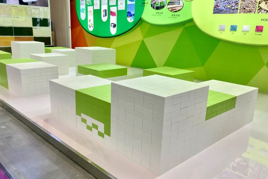 此外,丽诺集团还展示了创新的终端产品 “丽诺砖”。“丽诺砖”主要原材料为回收的PP餐盒,将废弃餐盒回收再利用,探索餐盒塑料循环新模式,实现“餐盒重生”。该产品可应用于各种空间临时性或永久性装置,同时,该产品也与外卖头部品牌美团合作,使废塑料再生成为有趣的终端产品。