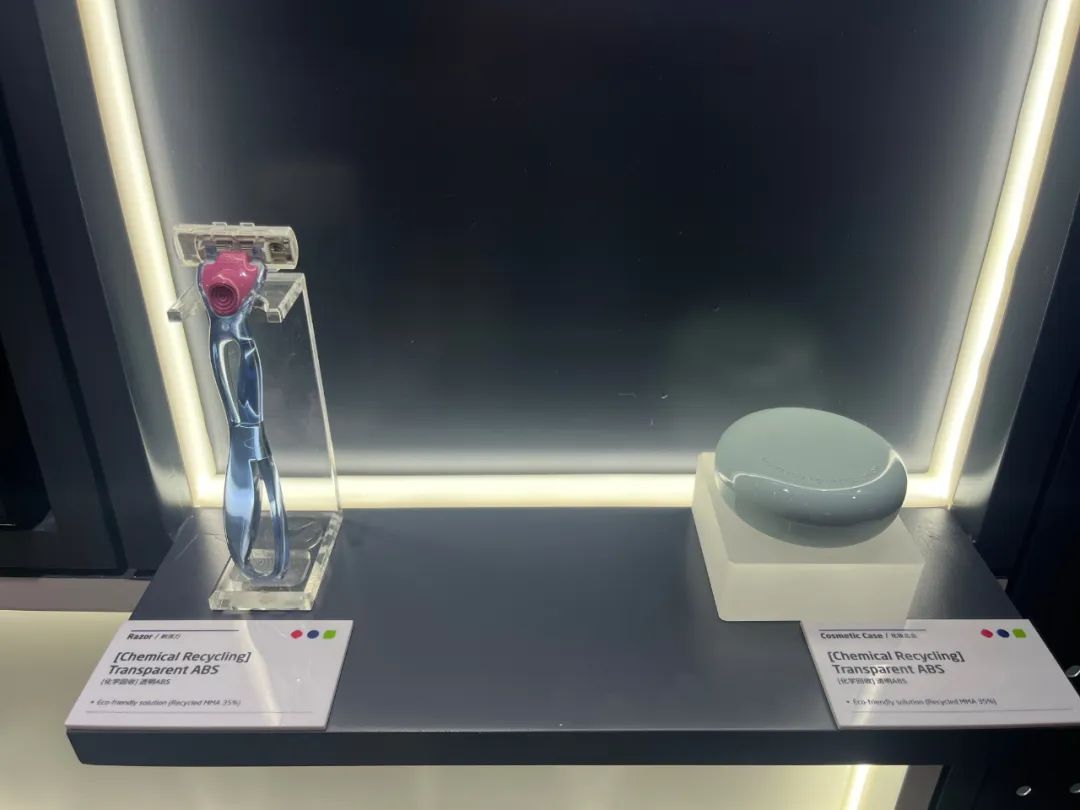 其中有一款产品是由化学回收ABS制成的便携式剃须刀,具有一般透明ABS同等水准的抗冲击强度、透明度和流动性等。