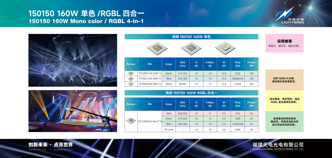 主打产品150150 160W 单色 / RGBL 四合一灯珠,凭借160W 大功率优势,可实现超高光通量,轻松满足大型演出场馆、户外舞台的高亮度需求;波长精准、色彩饱和,既能实现 RGBL 混光渲染,也可单独用于单色呈现,适配染色灯、频闪灯、摇头灯等多种舞台灯具。其铜基板封装设计具备更优的导热性和稳定性,有效解决高功率灯珠散热难题,保障设备长期稳定运行。