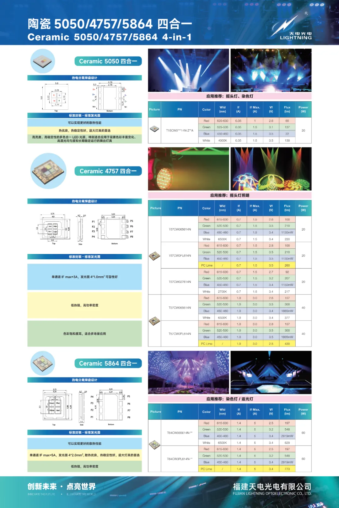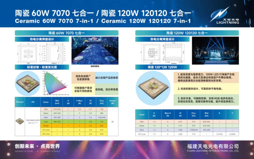 同步展出的陶瓷 60W7070 七合一、120W120120 七合一灯珠,采用热电分离焊盘设计,低热阻、高功率密度,不仅混色色域更广、色差更鲜艳,还能有效减小应用产品体积,可根据客户需求定制不同颜色,支持 RGB 多色混合与可编程控制,实现动态变色、图案切换等功能,大幅提升舞台视觉表现力,适配各类沉浸式演出场景。