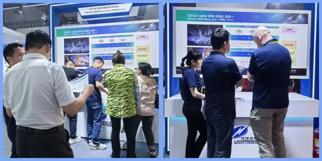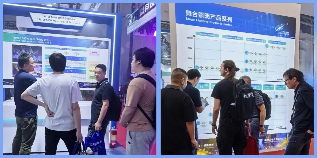 展会期间,天电光电展台人气爆棚,众多国内外客户驻足咨询,重点关注高功率产品的热管理稳定性、光效一致性及批量交付周期等核心需求。针对客户诉求,天电光电现场技术团队快速响应,提供定制化技术方案与本地化服务承诺,进一步强化客户信任,其产品凭借功率优势与多样化效果,成功成为大型演唱会、剧院演出、户外庆典等场景的核心备选产品。