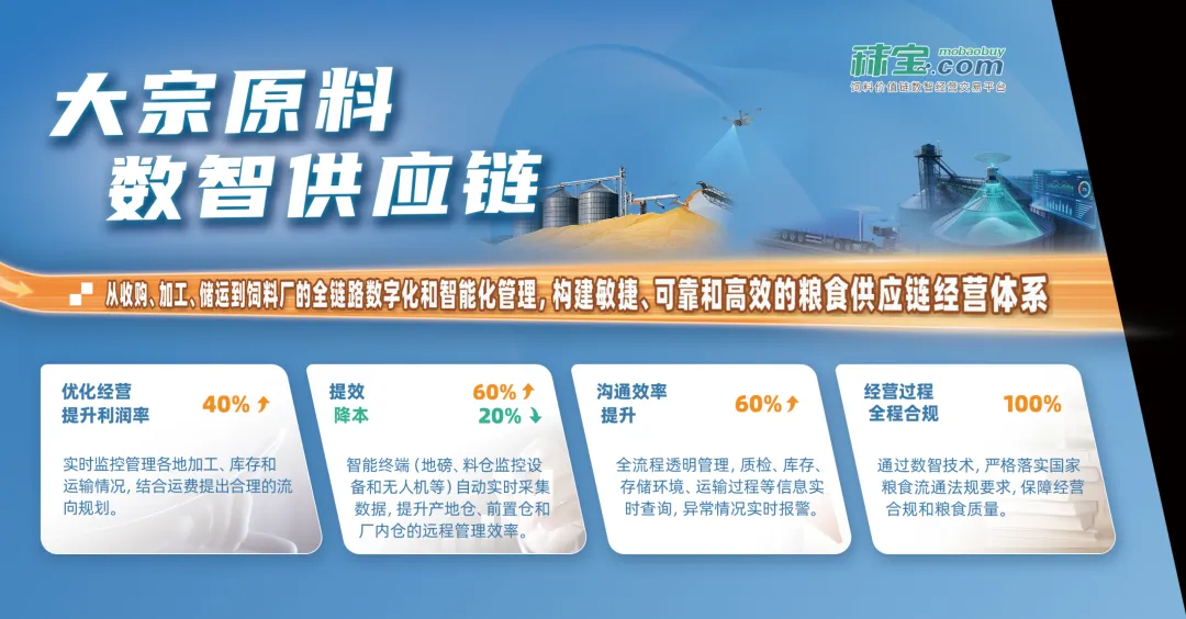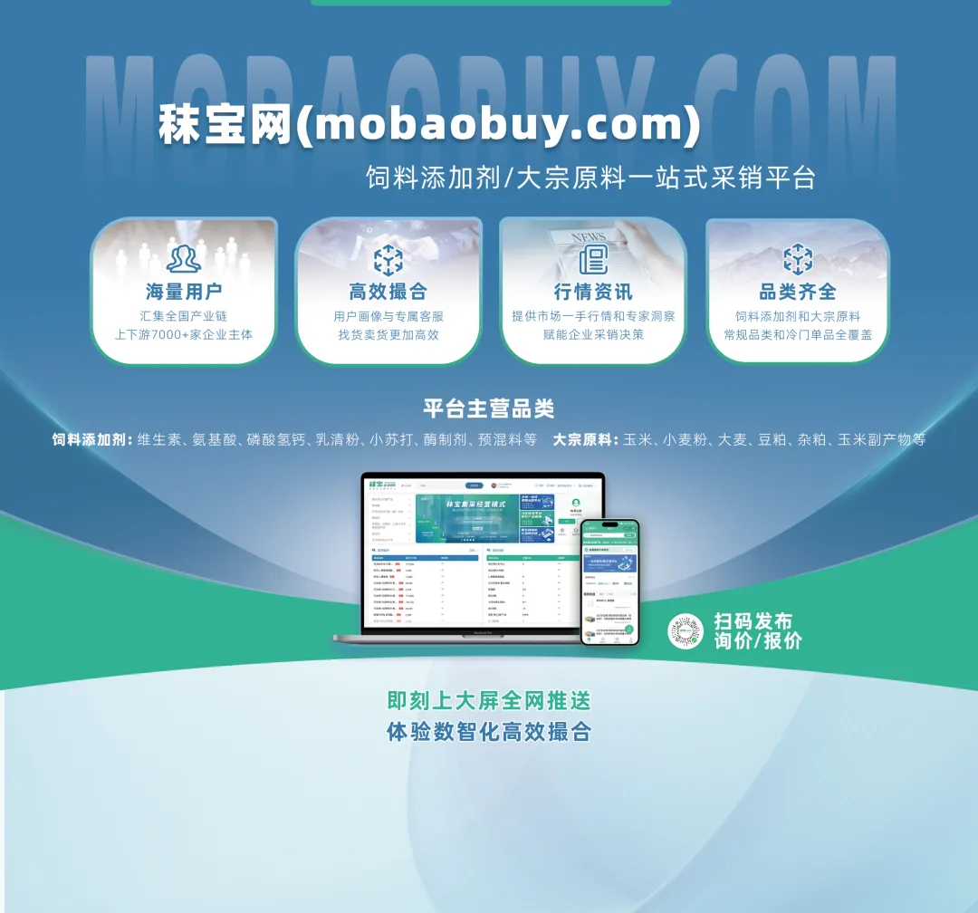 中国饲料工业展览会将于2026年4月18日–20日在南昌绿地国际博览中心盛大举办,欢迎各位业内专家莅临秣宝展位(A4A009)指导!秣宝网作为饲料添加剂/大宗原料一站式采销平台,全面覆盖维生素、氨基酸、磷酸氢钙等饲料添加剂以及玉米、豆粕、杂粕等大宗原料,兼顾主流品类及冷门单品。目前已链接产业链上下游超过7000家企业主体,提供全网询报价和一手行情资讯,以高效撮合机制为企业采销决策提供有力支持。秣宝饲易购是专门面向养殖场/饲料厂的零售平台,囊括多维、玉米、豆粕、磷酸氢钙、蛋氨酸、氯化胆碱等养殖场与饲料厂所需的饲料添加剂和饲料原料。不仅提供源头直供的正品保障,还支持灵活采购,一件起发、送货上门,降低采购门槛,让中小养殖场及饲料厂畅享高效又安心的采购体验。秣宝数智云工厂以数据贯通为核心,融合AI与算力模型,覆盖采购、库管、配方、生产、销售、质检以及设备等生产经营全流程和各环节,赋能集团公司高效管理,助力企业智转数改,实现降本增效。大宗原料数智供应链是从收购、加工、储运到饲料厂的全链路数字化与智能化管理体系,旨在优化企业经营,将利润率提高至少40%。通过实时的智能数据采集、信息查询、异常预警及100%合规保障,企业可轻松增强沟通,实现降本增效。从原料生产/储运企业,到饲料厂、养殖场及贸易商/户,秣宝以数字驱动、场景融合、质量安全、链接赋能为核心价值,致力于打造覆盖饲料产业全链路的数智经营生态平台。我们坚信,通过数据与AI的深度融合,定能为客户创造真实价值,与合作伙伴共赢未来。2026中国饲料工业展览会规模盛大,逾千家企业齐聚一堂,秣宝期待与更多伙伴共谋发展。【版权说明】