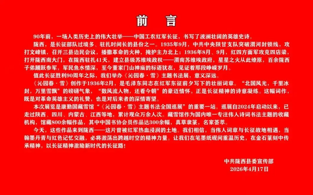 为纪念红军长征胜利90周年,弘扬伟大长征精神,一场汇聚红色文化与书法艺术精髓的盛宴——《沁园春·雪》主题书法展,将于2026年4月17日在陇西县美术馆隆重拉开帷幕。展览将持续至5月6日,为广大市民和书法爱好者提供一个重温峥嵘岁月、感受笔墨豪情的绝佳平台。