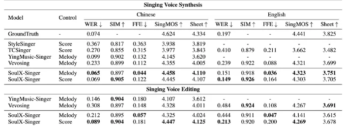 在客观评测环节,SoulX-Singer在GMO-SVS和专门构建的SoulX-Singer-Eval两个数据集上接受了严格检验。GMO-SVS集合了GTSinger、M4Singer、Opencpop等主流开源数据集的精华,而SoulX-Singer-Eval则通过独立音乐人渠道采集数据,确保测试歌手完全未在训练集中出现,从而真实检验模型的零样本能力。评测结果显示,SoulX-Singer在语义清晰度、音色相似度、基频准确性和整体听感质量等多个维度均优于现有开源方案,主观盲测同样获得了听评者的高度认可。