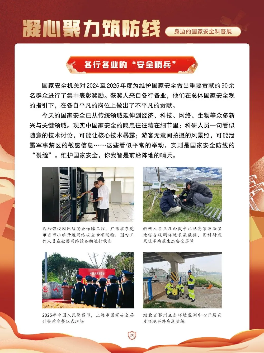 国家安全是安邦定国的重要基石,维护国家安全是全国各族人民根本利益所在。从边防哨所的彻夜值守到实验室的技术攻坚,从田间地头的耕耘收获到网络空间的风险防范,国家安全的维度遍布生活肌理,守护安全亦需全民在细微处尽责。