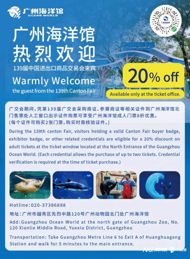 广州海洋馆,集展示、观赏、科普和教育为一体的多功能城央精品海洋馆。4月12日至5月8日,凭第139届广交会“参展证”或“采购证”“服务证”等广交会相关证件,可享广州海洋馆(成人票)的 8 折优惠。