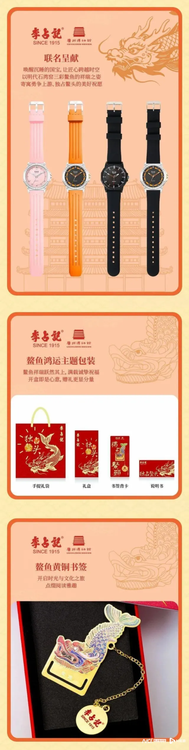 百年老字号李占记携手广州博物馆将馆藏“明万历石湾窑鳌鱼”化作腕间神韵以独占鳌头的美好寓意把非遗匠心与国货底蕴,变成“腕表”,成为用户日常的陪伴;该次跨界合作,还推出了文创“鳌鱼黄铜书签”。