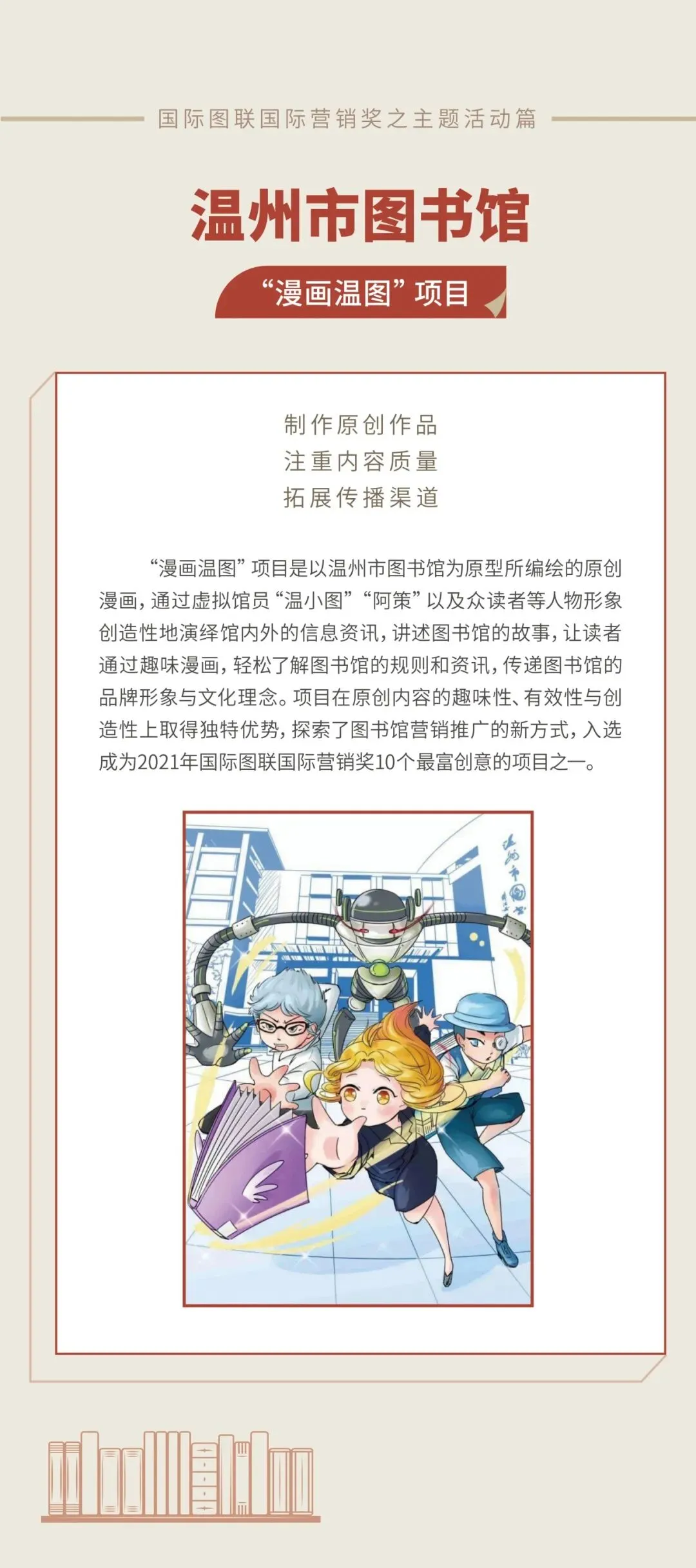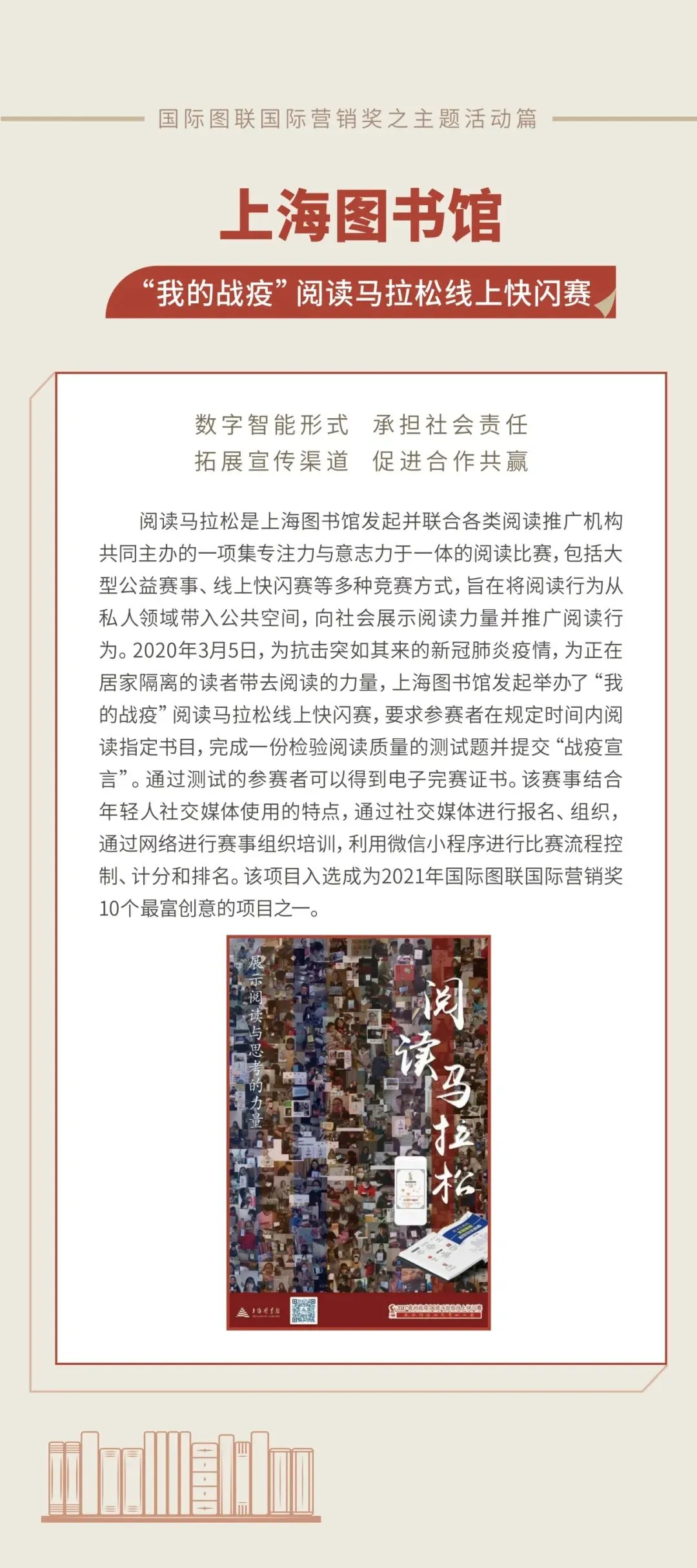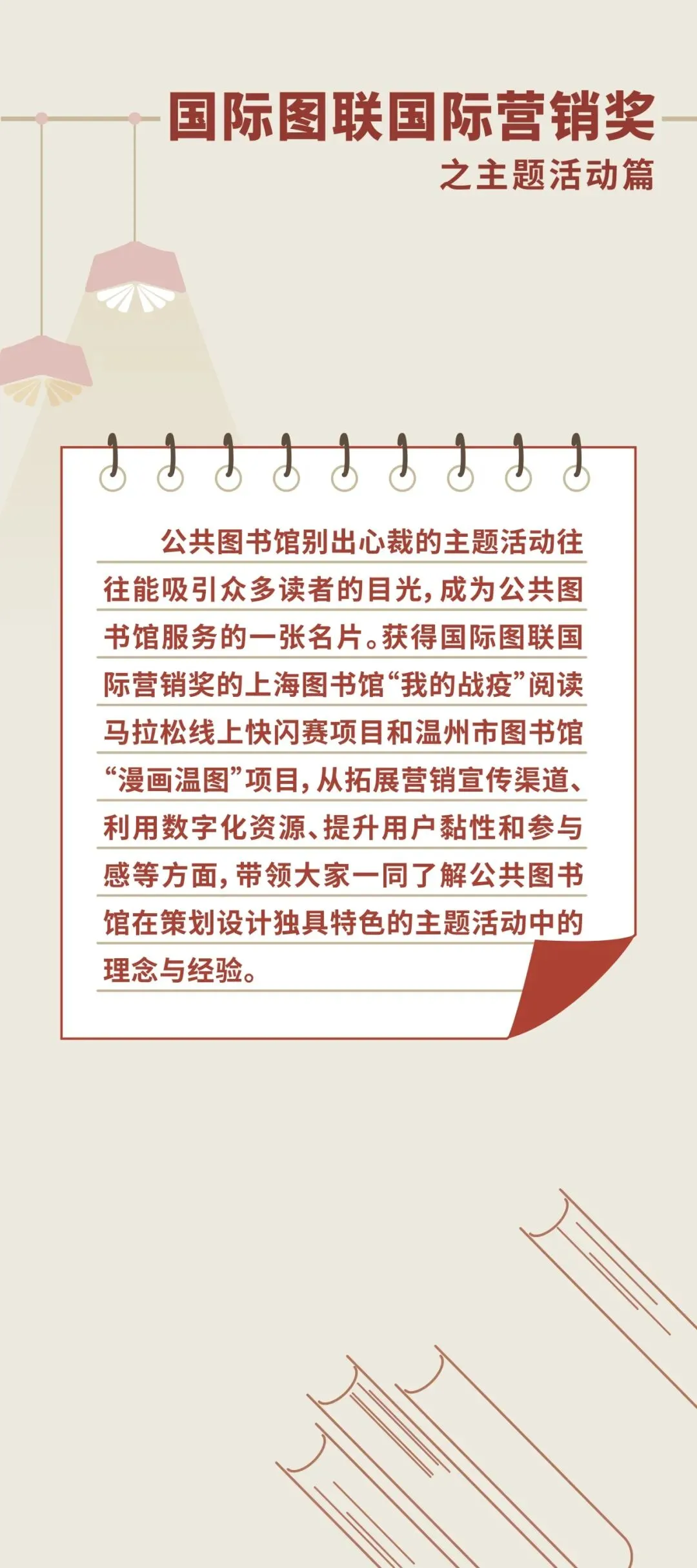 本次展览,分为国际图联获奖图书馆案例展、特色阅读空间图文展和图书馆服务成果展。希望通过展览的宣传,为全国公共图书馆学习公共文化服务领域优秀案例和先进经验提供参考,也为各地区新型阅读空间建设、服务模式创新、文旅融合路径探索等提供新的思路和方法。通过全面、广泛、有效地对公共图书馆服务进行宣传推广,吸引全社会关注和参与图书馆活动,提高图书馆活动的社会影响和服务效能,彰显图书馆服务的社会价值。