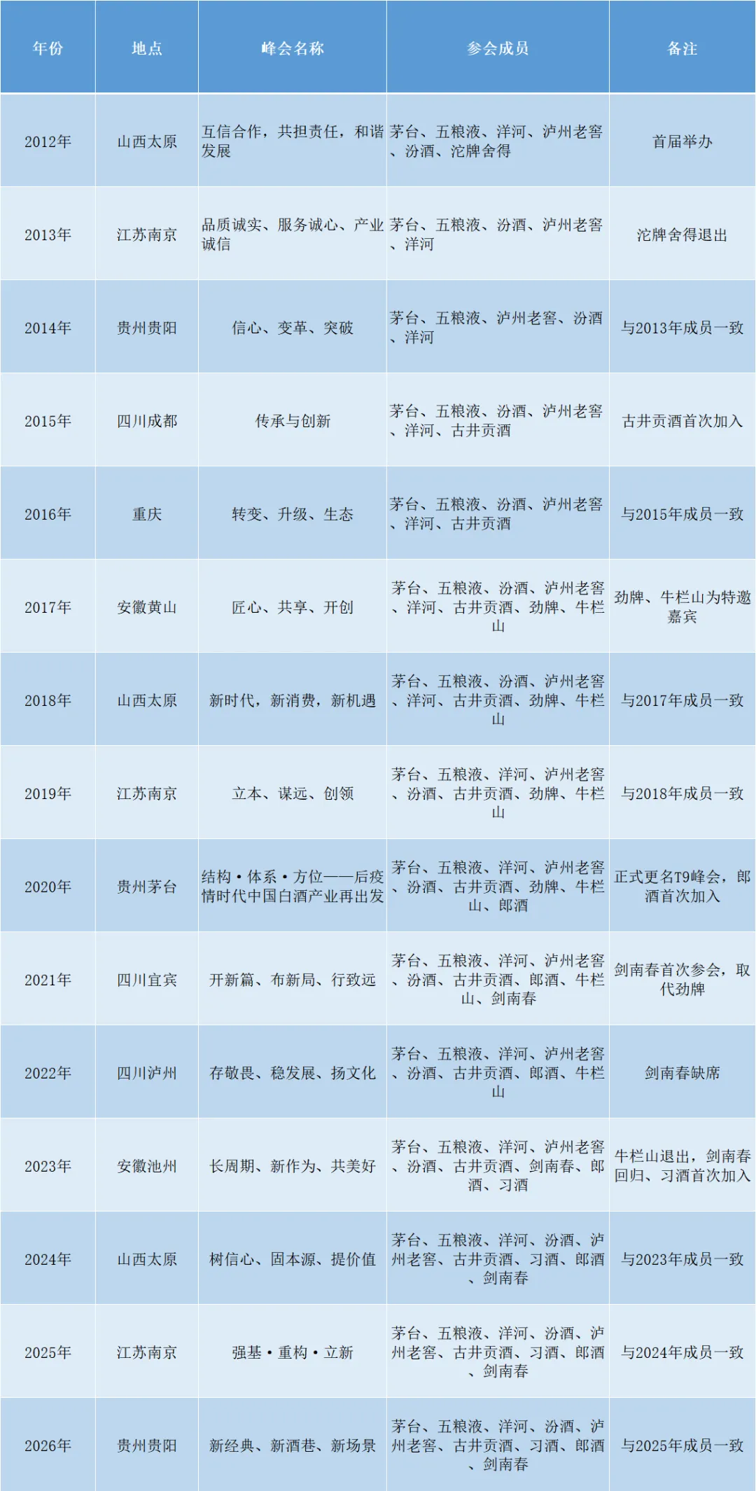 十五年来,T9的成员构成几经更迭,从最初的T6(茅台、五粮液、洋河、泸州老窖、汾酒、沱牌舍得),到中间吸纳古井贡酒、劲牌、牛栏山,再到2020年引入郎酒并正式定名T9,直至2023年习酒入局、牛栏山淡出,最终形成了当前由茅台、五粮液、汾酒、泸州老窖、洋河、古井贡酒、郎酒、习酒、剑南春组成的稳定阵容。