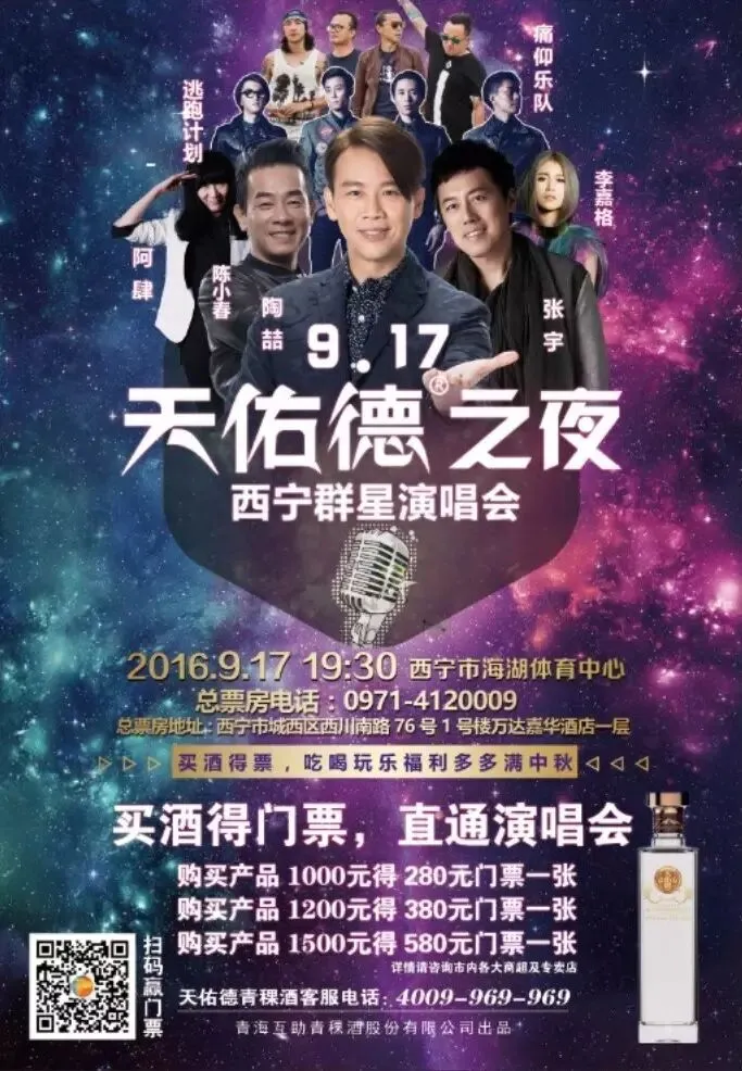 万万没想到在今夏热热闹闹玩过环湖赛后,天佑德青稞酒又转变套路,玩起新花样,在西宁冠名了一场史上最大的群星演唱会——917天佑德之夜。本次演唱会请到了港台明星陈小春、陶喆、张宇;两大乐队逃跑计划和痛仰乐队;还有新声代力量第三季《中国好歌曲》(原名中国好声音)学员阿肆、李嘉格倾情助力。