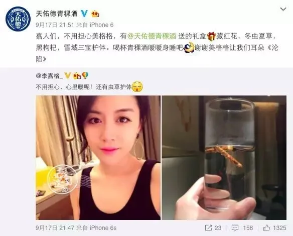 除此以外,天佑德早有先见之明,预先在明星下榻酒店放置礼盒,除赠予明星天佑德有机青稞酒外,更将高原雪域特有的三宝稀有虫草、藏红花、黑枸杞作为礼物赠予明星。天佑德的无心插柳反倒成阴荫,此举必然会让品尝过美酒的诸位明星记忆深刻。以后提到高原、提到西北便能够想起天佑德有机青稞酒。这种营销模式不仅是连带关系,更是共生的合作关系。