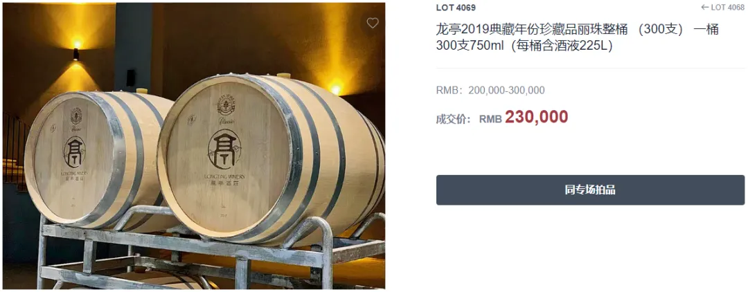 12月26日,在中国嘉德2022秋季拍卖会“嘉酿醇香——世界名庄葡萄酒”专场,龙亭酒庄珍藏品丽珠红葡萄酒2019年份(整桶限量版)作为该板块唯一一件以整桶形式呈现的拍品压轴登场,并在超过半数拍品流拍的情况下以23万元的价格成交。
