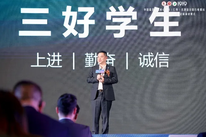 壹玖壹玖集团有限公司董事长杨陵江现场分享了1919从“三好学生”到“五好公司”的成长历程。在他看来,1919相当于一个巨大的插线板,1919的直营店、加盟店、线上店、“中国酱酒馆”等就像一个个插头,需要好模式、好品牌、好团队、好技术和好商品为其提供充沛的能量。杨陵江希望日均订单三年内能从现在的3万单做到100万单,为所有门店带去更多订单;年交易额能做到500亿,为酒厂也带来更多订单。