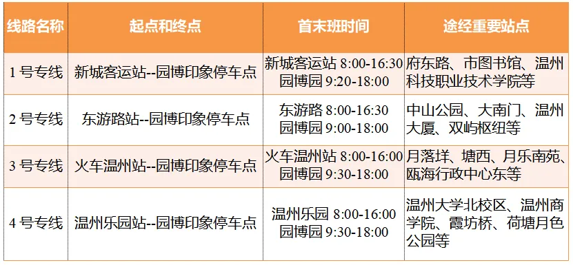 市区选择园博园交通专线出行的旅客,可选择园博园专线1号(新城站出发经市政府)、2号(东游路站出发经五马街)、3号(火车温州站出发经梧田老街)、4号(温州乐园出发经大学城、南湖万象城)前往园博园(园博印象),票价5元,不享受优惠政策。