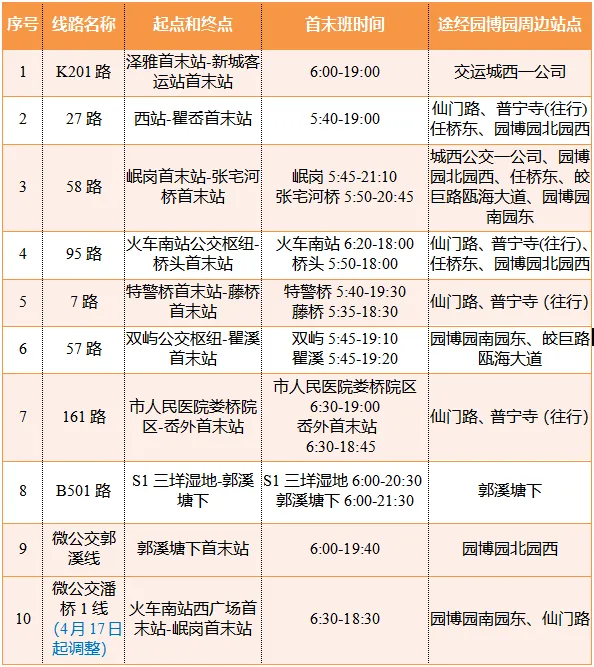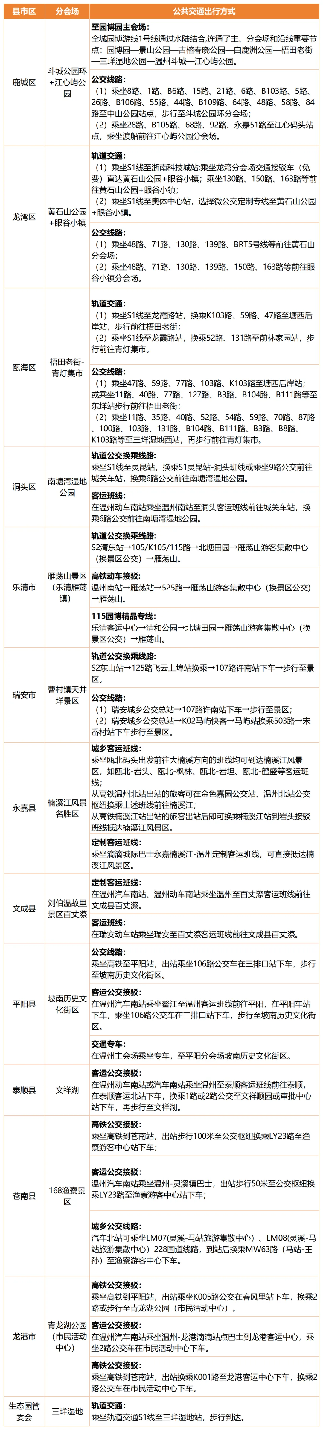 3.抵达火车温州站的旅客,可乘坐园博园3号专线抵达园博园(园博印象);可在车站大道“火车温州站”乘坐公交7路抵达瓯海大道“普宁寺站”,步行前往;也可乘坐公交62路、99路抵达S1惠民路站换乘轨道交通S1线前往动车南站站,再换乘轨道接驳公交前往。