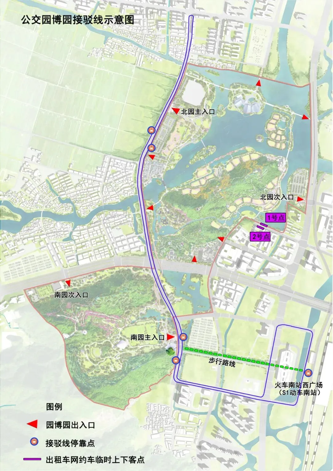 乘坐轨道交通S1线的旅客,可在S1动车南站站换乘轨道接驳公交至园博园主会场南园及北园,或步行至南园。
