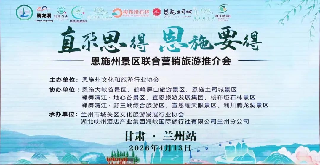 2026年4月13日,一场聚焦鄂甘文旅交流合作的盛会——《2026恩施州核心景区甘肃·兰州推介会》在兰州市长城建国饭店盛大举行。此次推介会由恩施州文化和旅游行业协会主办,鹤峰屏山旅游景区、恩施土司城景区等众多知名景区协办,湖北峡州酒店产业集团海峡国际旅行社有限公司兰州分公司承办,兰州城关区文化旅游发展行业协会积极组织各旅游企业领导及摄影、媒体界100人参与其中,共同见证恩施州文旅的独特魅力与无限潜力。