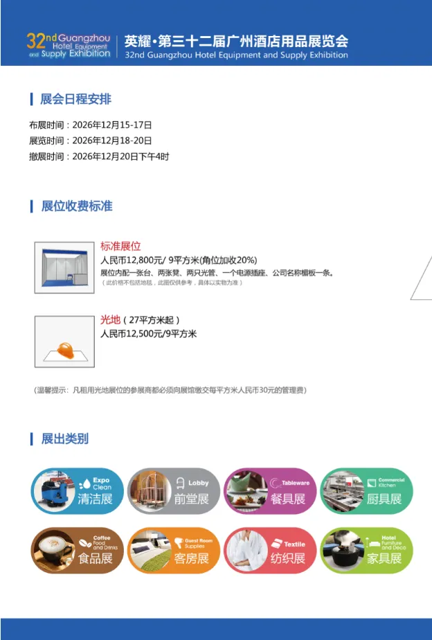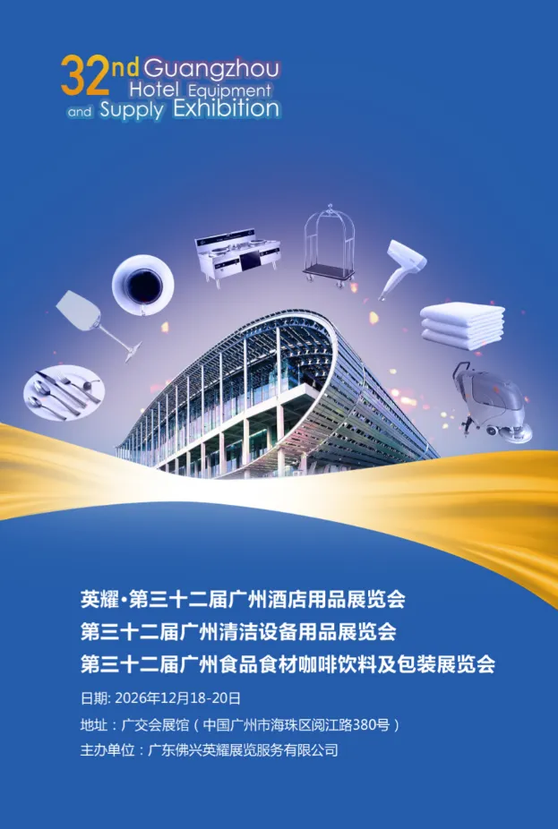 第三十二届广州酒店用品展览会,将于2026年12月18-20日在广州中国进出口商品交易会琶洲展馆盛大举行。佛兴英耀广州酒店用品展览会致力于为业内企业打造一个立足国内辐射国外的采购交流平台。老客户再参展率高、新客户多,展览规模大,预计2026年展览面积30万平方米,将聚集全世界3000多家企业参展,吸引来自世界各地20万之多专业买家到会采购,其中包括来自100多个国家和地区的海外买家上万人。