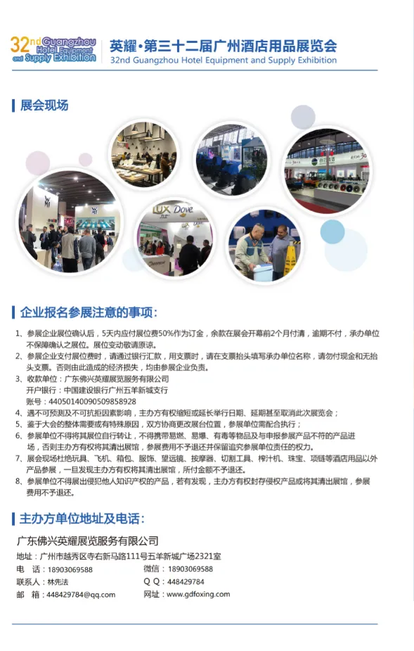 本届展会将为您提供与采购决策者面对面交谈、展示您的产品与服务的绝佳机会,为您与商家之间建立贸易桥梁,无论您是想提高本土竞争力或是开拓国际市场,该展都是您的捷径!作为年度行业盛事,每届12月份广州酒店用品展览会都是主流媒体与行业报道的热点。为行业增光,为企业增值,本届展会由广东佛兴英耀展览服务有限公司主办,邀请相关专业的杂志、门户网站、网络推广平台,走访各地卖场、联合广大参展商对展会进行一系列立体式的宣传推广。我们诚挚的邀请贵单位前来参展,共创双赢!