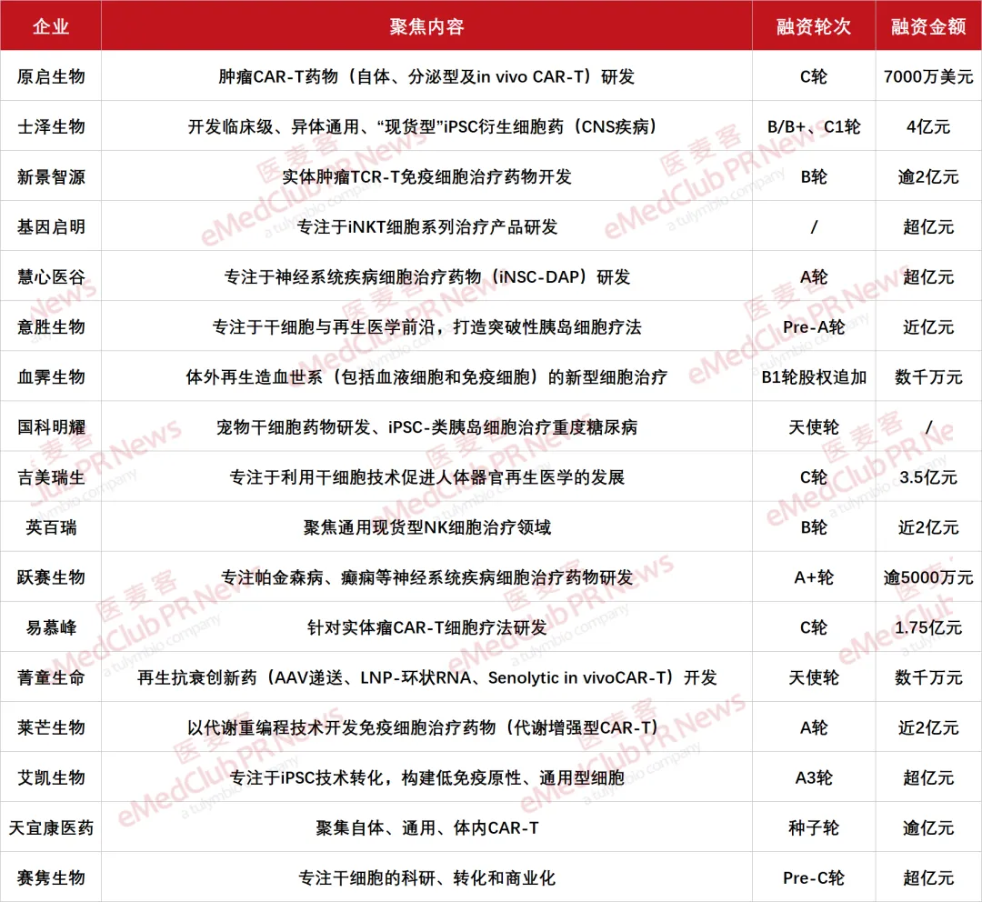 从融资轮次分布来看,跨度范围广,从种子轮/天使轮到 A 轮,再到 B 轮和 C 轮均有,资本对早期项目及成长期项目各有偏好。其中,种子轮、天使轮共 3 起,覆盖宠物干细胞药物、再生抗衰创新药、体内 CAR-T 等前沿创新方向,资本注重差异化布局和源头创新;Pre-A 轮、A 轮、A + 轮、A3 轮共 5 起,聚焦 iPSC 技术转化、干细胞疗法、代谢增强型 CAR-T 等具备临床潜力的项目。