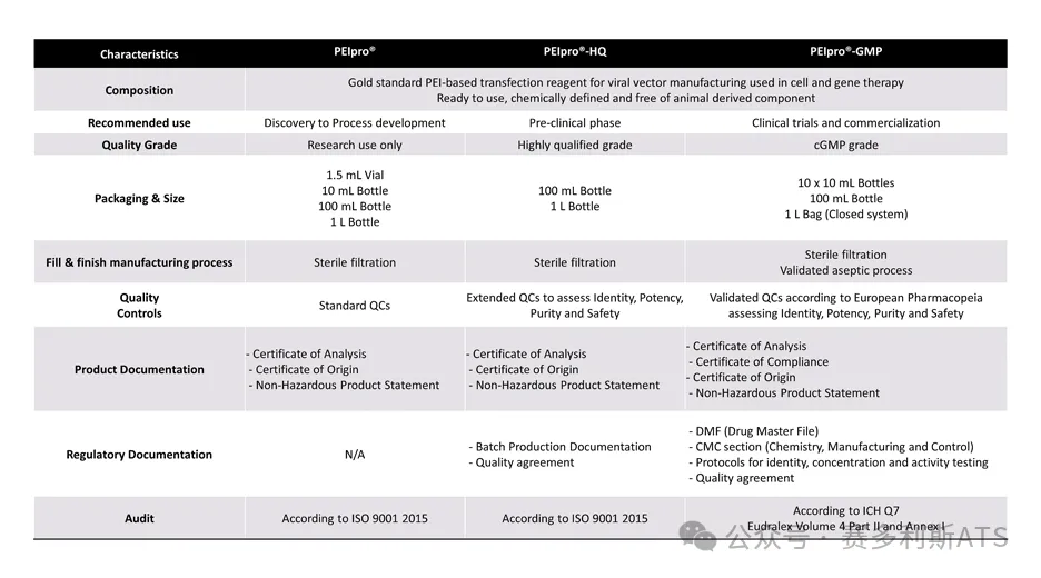 PEI的生产遵循非常严格的质量控制和法律法规,有三个质量等级:研发级的PEIpro®用于工艺开发,更好质量等级的PEIpro®-HQ用于临床前研究和早期临床试验,最高质量等级即完全GMP级别的PEIpro®-GMP可用于临床病毒载体的生产(包括慢病毒,腺病毒,腺相关病毒等),满足细胞治疗和基因治疗的质量和监管要求。