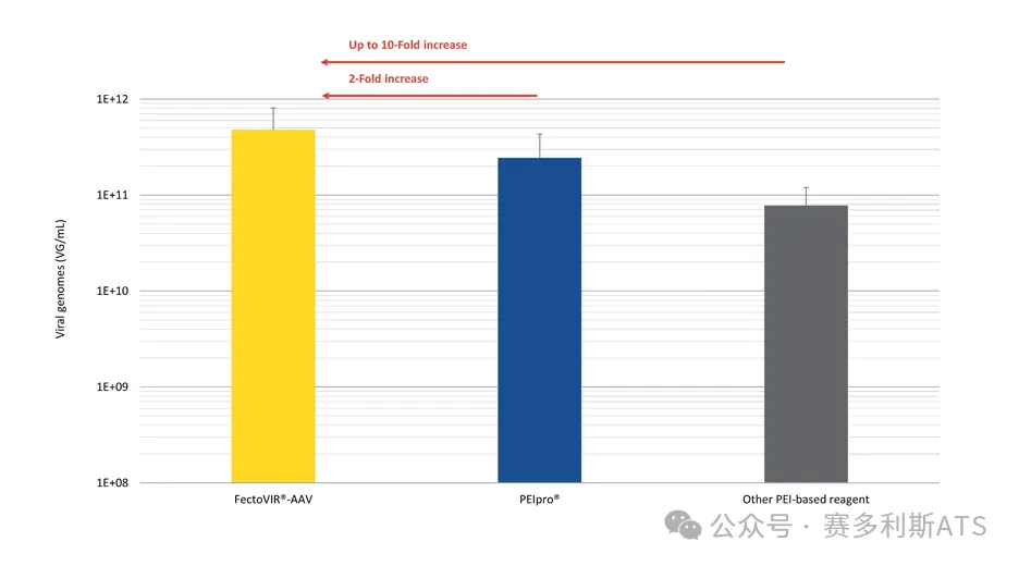 与PEIpro®和其他竞争对手相比,FectoVIR®-AAV 在悬浮细胞中能生产更高滴度的rAAV病毒载体。与其他竞争对手相比,FectoVIR®-AAV可重复性地大幅提高 AAV 产量,可高达10 倍。