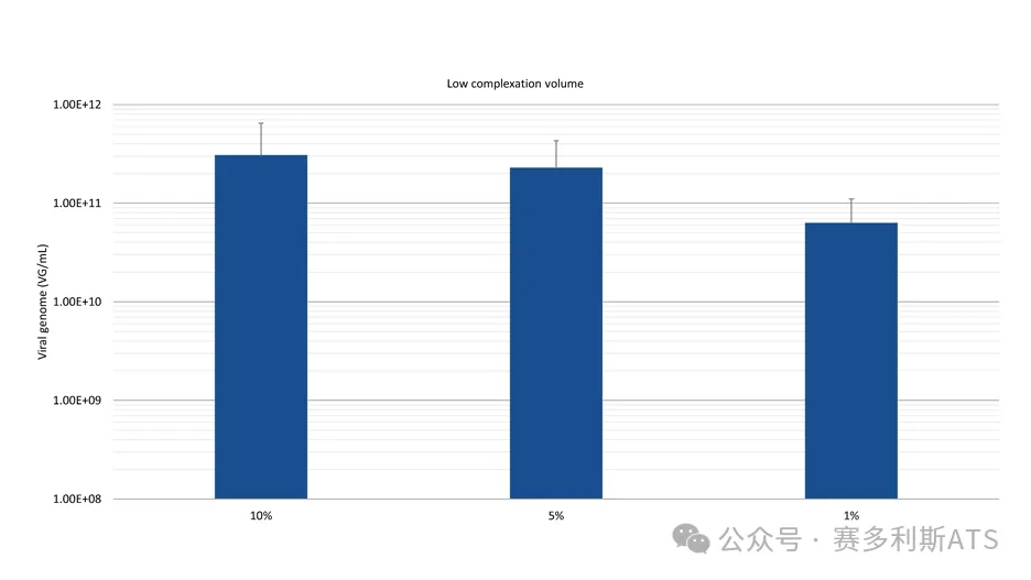 使用FectoVIR®-AAV制备不同体积的转染复合物:最终培养体积的10%,5%和1%。转染后72小时使用qPCR定量检测。