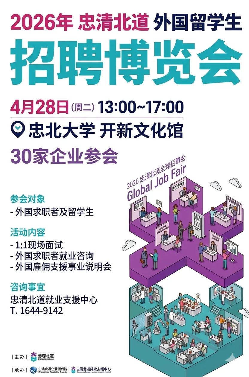 为帮助中国留学生拓展就业机会,学校将组织参加“2026忠清北道外国留学生招聘博览会”,现将相关事项通知如下: