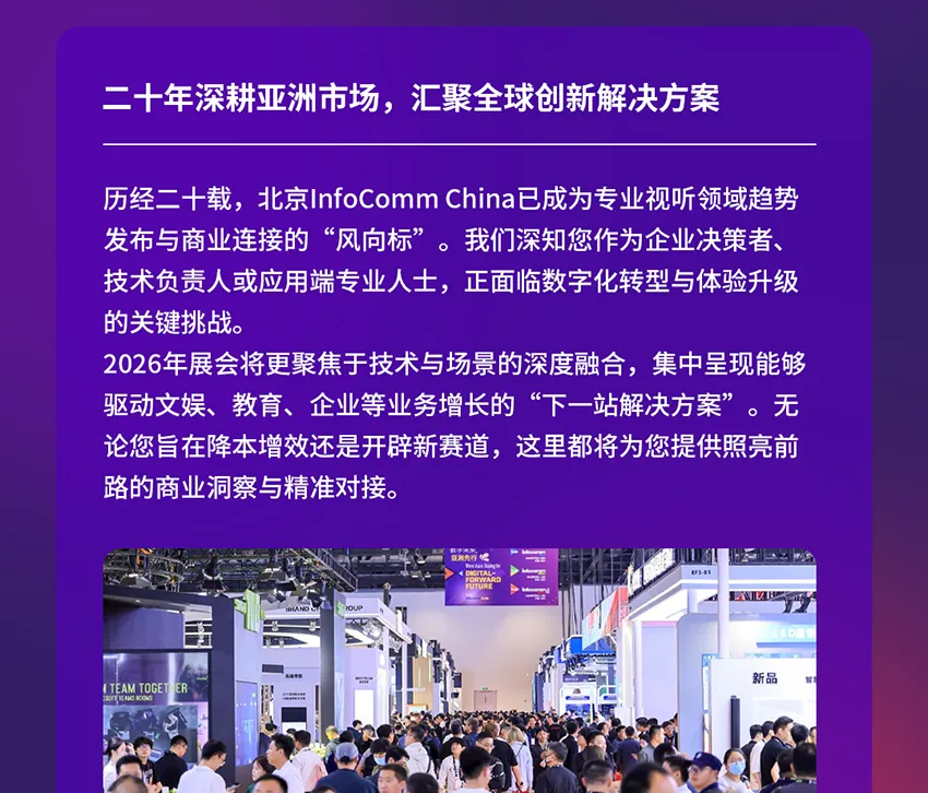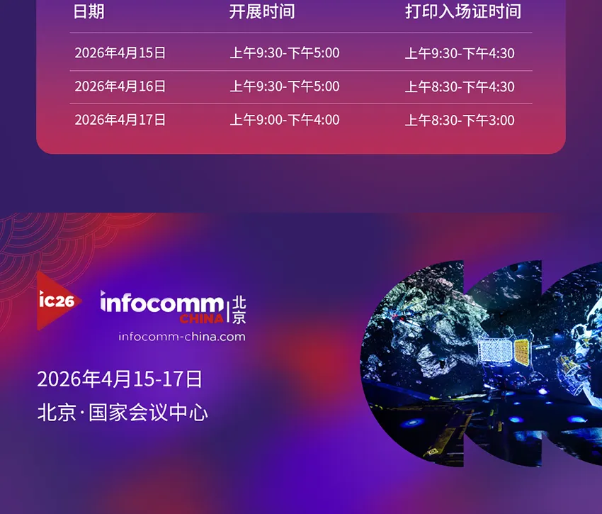 2026年4月15-17日,北京InfoComm China将在国家会议中心盛大举办,并迎来二十周年里程碑。本届展会聚焦AI视听、企业IT、教育、文旅、娱乐五大核心场景,汇聚专业视听及系统集成领先技术与年度重磅新品,打造一站式前瞻、对接、落地平台。