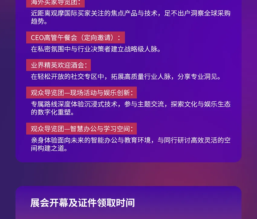 *声明:以上信息来源于展会官方,活动内容真实有效,展会举办时间和地点具有一定变更风险,请以收到的电子门票凭证为准,平台也将为预订门票的用户提供电话、短信通知提醒,避免用户出行损失。