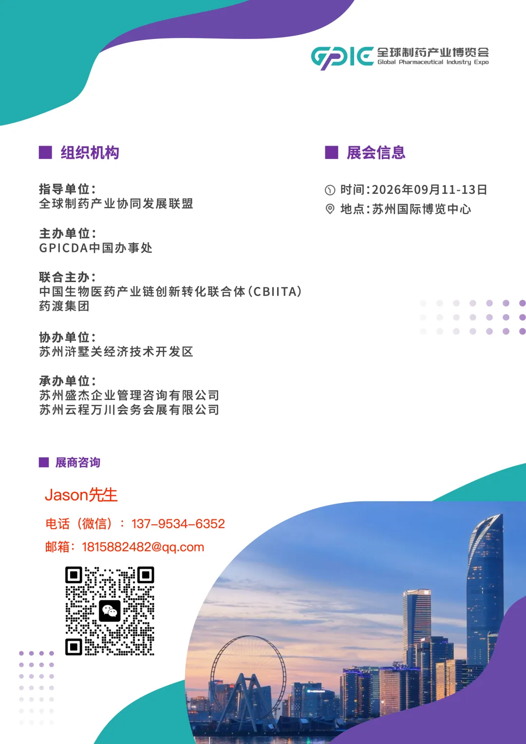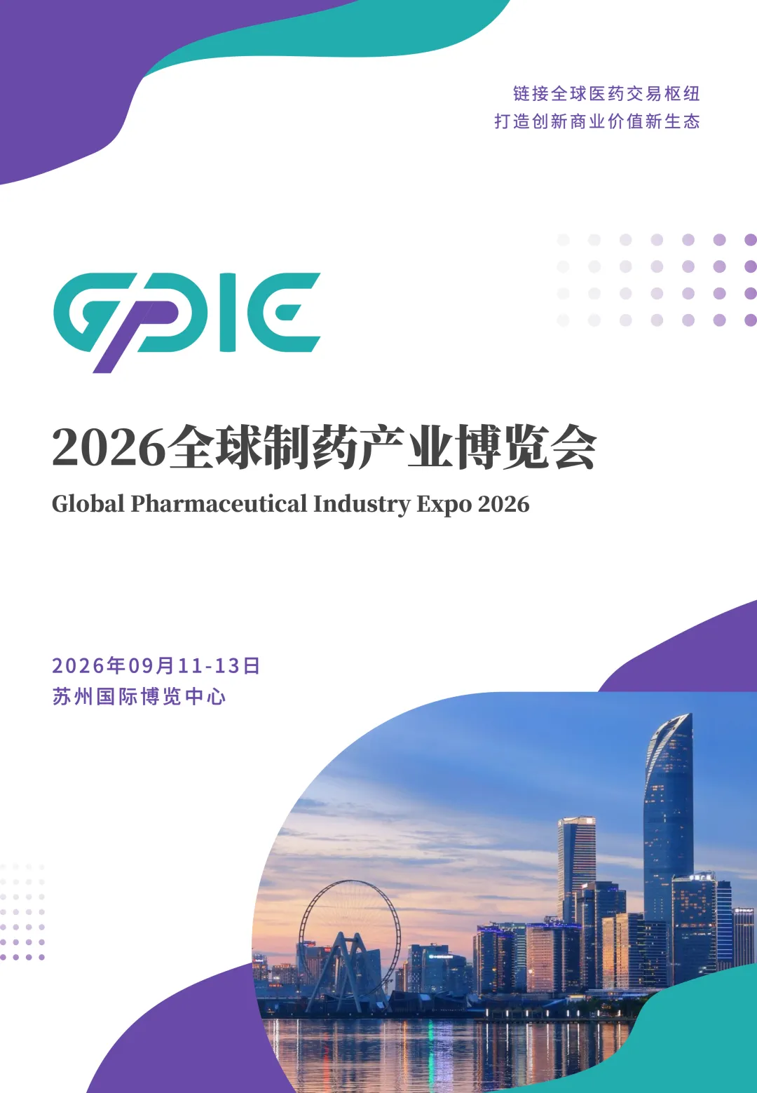2026 全球制药产业博览会将于2026 年 9 月 11–13 日在苏州国际博览中心举办,展会规模达50,000㎡,汇聚50 + 国家、1,000 + 家展商,预计吸引50,000 + 专业观众、对接3,000 + 意向采购企业,覆盖制药研发、生产、供应链、临床应用全产业链。