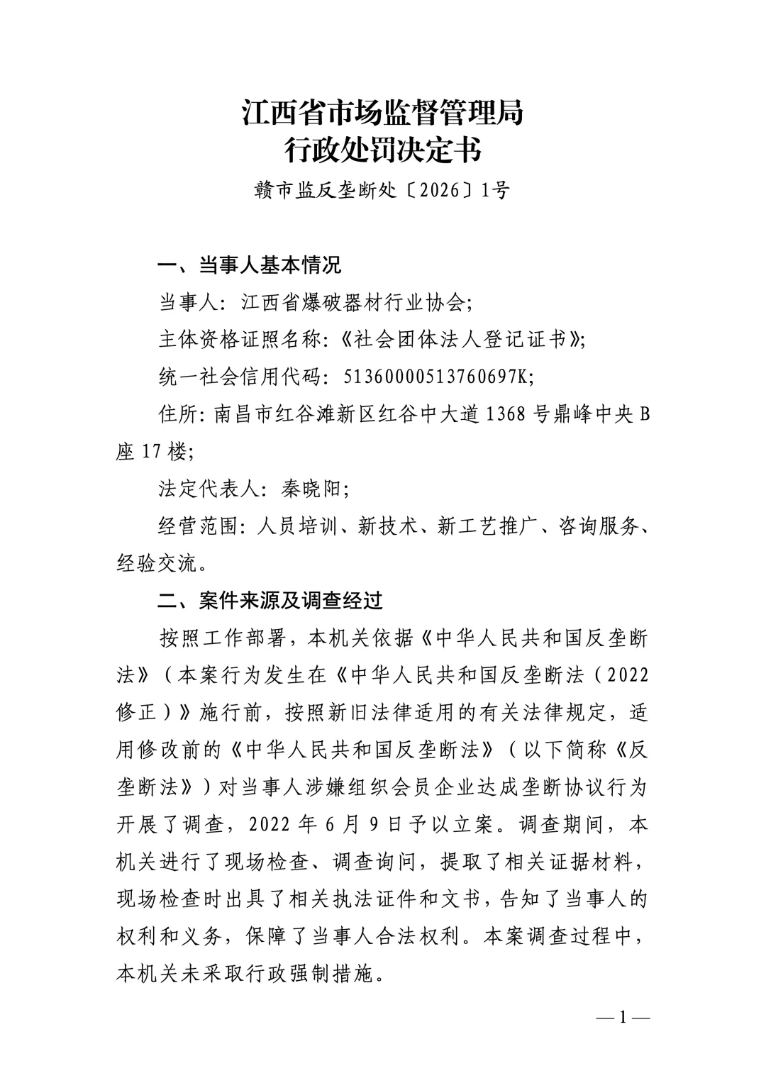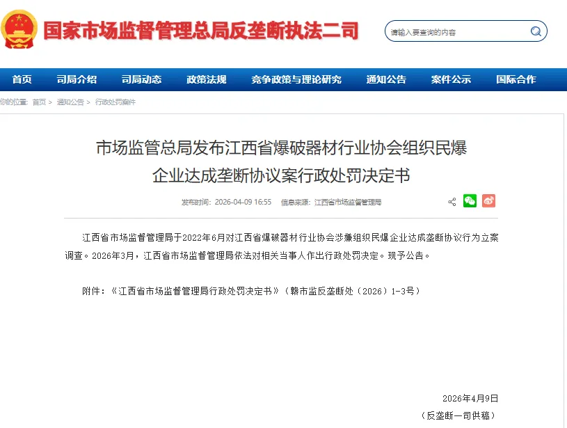 江西省市场监督管理局于2022年6月对江西省爆破器材行业协会涉嫌组织民爆企业达成垄断协议行为立案调查。2026年3月,江西省市场监督管理局依法对相关当事人作出行政处罚决定。现予公告。