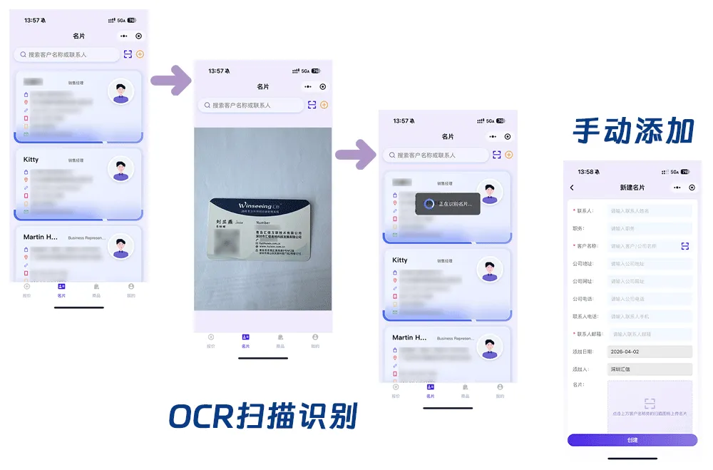 采购商对某款产品感兴趣,业务员只需用手机打开“汇有单”,扫描采购商名片或让其扫码,即可秒级交换电子名片,建立初步联系。
