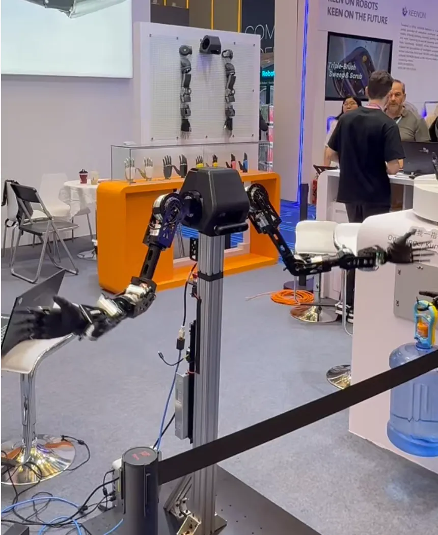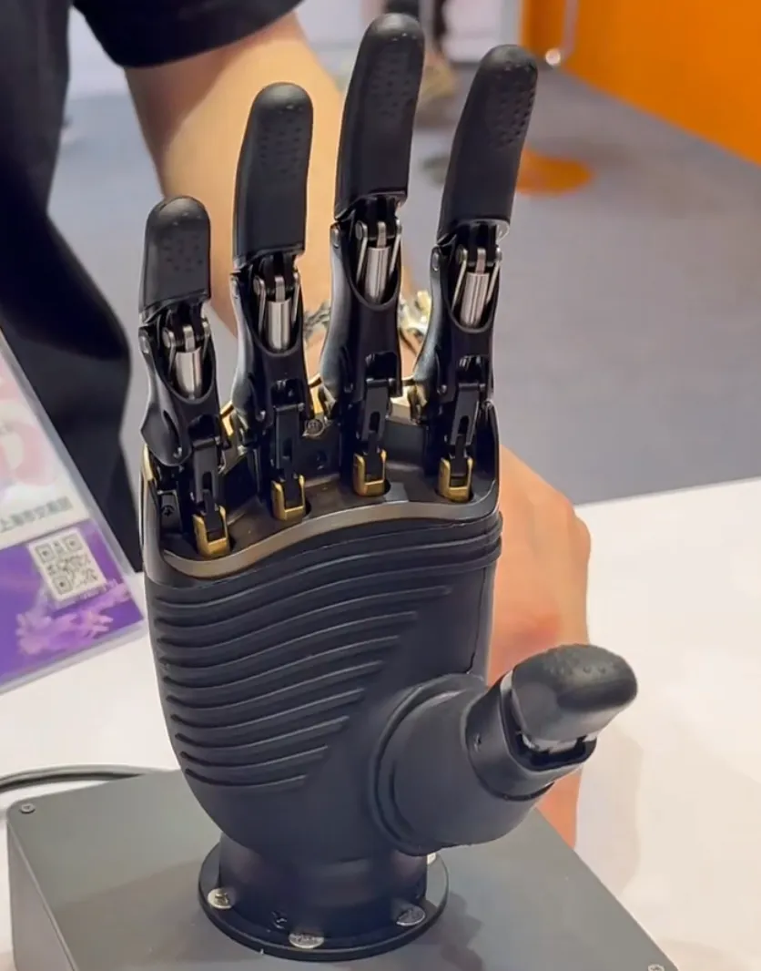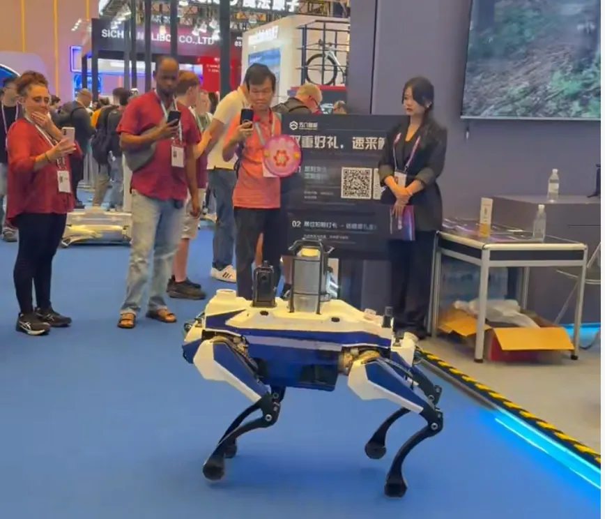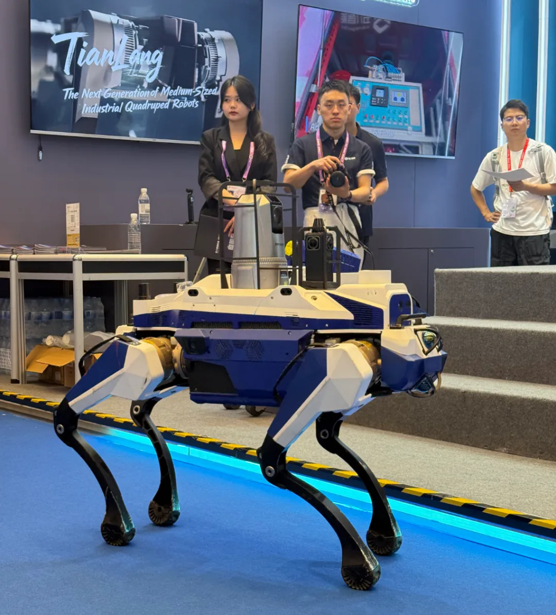 工业级“显眼包”: 展位上这台名为 Tianlang(天狼) 的四足机器人正灵活穿梭 ,旁边这款精密仿生机械手更是吸引了无数外贸老兵驻足研究 。