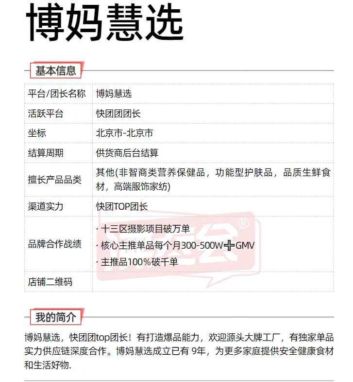 博妈慧选,坐标北京,快团团团长,供货商后台结算,擅长非智商类营养保健品、功能型护肤品、品质生鲜食材、高端服饰家纺。