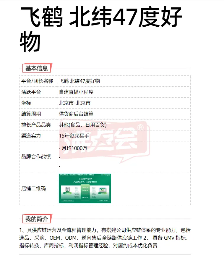 飞鹤北纬47度好物,坐标北京,自建直播小程序,供货商后台结算,擅长食品、日用百货。