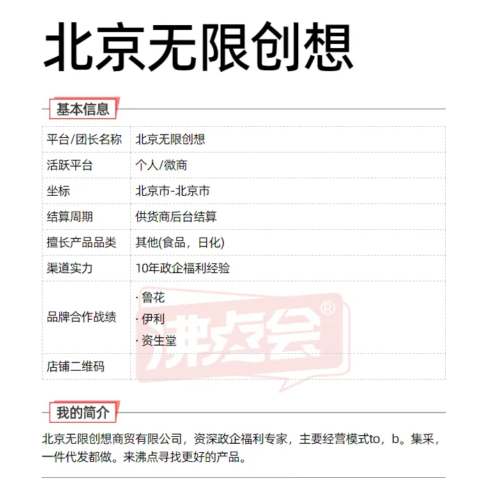 北京无限创想,坐标北京,主要经营模式to B,集采、一件代发都做。供货商后台结算,擅长食品、日化。
