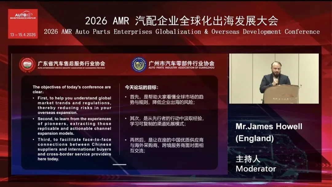 大会正式开启后,主持人 James Howell 在开场中提到,当前全球汽车产业链正经历深度重构,中国汽配出口额连续多年保持攀升态势,企业布局全球化已经从过去的可选项,变成了如今必须面对的必答题。与此同时,大量汽配企业在出海过程中依然面临着渠道单一导致议价能力不足、各国合规政策复杂多变暗藏风险、优质供应商与海外采购商之间信息壁垒难以打通等现实问题,而本次大会正是为了解决这些行业痛点而举办,依托 AMR 展会庞大的全球客商资源,聚焦渠道拓展、供需对接、合规赋能三大核心方向,致力于为企业搭建真正一站式的出海服务平台,帮助企业看懂全球市场趋势、降低出海风险、学习可复制的渠道拓展模式,实现中外供需双方高效面对面对接。