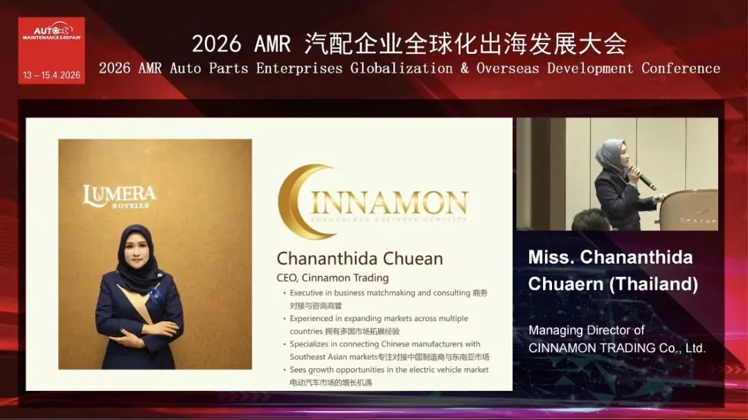 泰国CINNAMON 贸易公司总经理 Chananthida Chuaern 为现场企业带来了泰国汽车后市场的采购需求与供应链合作机遇解读。泰国作为全球第 11 大汽车生产国,是东盟地区的汽车产业枢纽,拥有超 2400 家汽配供应商形成的完善产业生态,当地电动车市场正以每年 25%-30% 的速度快速增长,政府推出 30@30 政策,目标 2030 年电动车产量占比达到 30%,为汽配企业带来巨大发展空间。泰国国内车辆保有量超 800 万辆,传统燃油车配件需求保持稳定,电动车电池、电驱、智能传感器等零部件需求持续旺盛,中国供应商凭借成熟的产能与高性价比优势,已经成为泰国市场重要的合作伙伴,泰国也成为中国汽配企业进入东盟市场的关键门户。