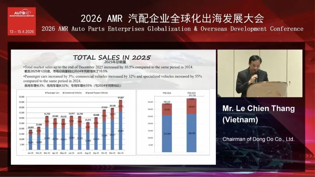 越南 Dong Do 公司董事长 Le Chien Thang 分享了电动汽车时代下越南汽车零部件市场的增长前景与合作机遇。数据显示,2025 年越南汽车零部件进口总额达到 59.3 亿美元,同比大幅增长 21.5%,其中中国以 24.74 亿美元的供应规模稳居越南第一大零部件来源国。越南采购商高度认可中国产品的价格优势、品类丰富度、定制化能力与便捷的物流条件,同时在选择合作供应商时,也会重点考量厂商信誉、生产能力、交付稳定性与产品合规性,对于中国企业而言,进入越南市场需要精准匹配本地消费需求,保障产品质量,把控贸易政策与合规风险,从而实现稳定深耕。