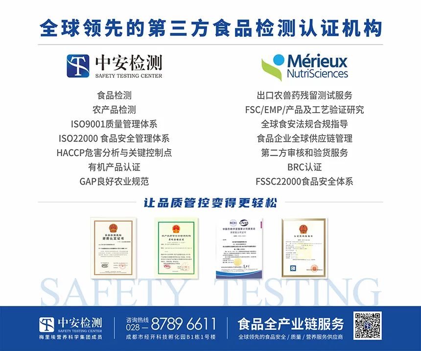 中安检测作为国内权威第三方食品检测机构,一直秉持“为企业鉴优良品质,为消费者健康与安全保驾护航”的企业使命,专注于从农田到餐桌的食品农产品安全技术服务,努力帮助食品企业防范食品安全事故,陪伴食品企业一同成长。中安检测目前依托梅里埃营养科学全球实验室资源与顶尖技术团队,可为中国食品生产企业提供产品检测、进出口检验、技术及法规咨询、审核、培训、合同研究和感官评估等多项优质服务。