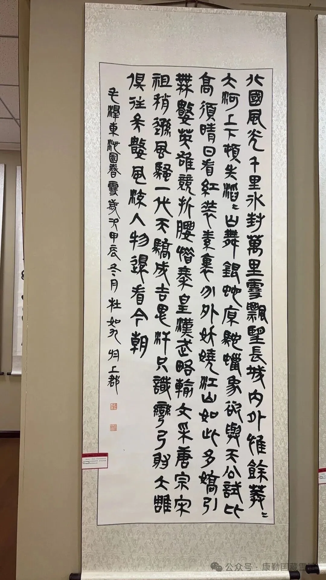 这次展览由中共陇西县宣传部、陇西县文体广电和旅游局、陇西县文学艺术界联合会主办;中共陇右工委纪念馆、陇西县美术馆、陇西县文化馆、康勤国藏雪馆承办。 展览以毛泽东同志气吞山河的经典词作《沁园春·雪》为唯一创作内容,精心遴选了来自藏雪馆的90余幅书法精品。这些作品跨越时空,涵盖了楷书、行书、草书、隶书、篆书等多种字体,或溯源魏晋,或取法秦汉,真草隶篆,各具神采,将词作中“千里冰封,万里雪飘”的壮阔意境与“数风流人物,还看今朝”的革命豪情,通过笔墨的浓淡干湿、线条的流转飞动,淋漓尽致地呈现在观众面前。