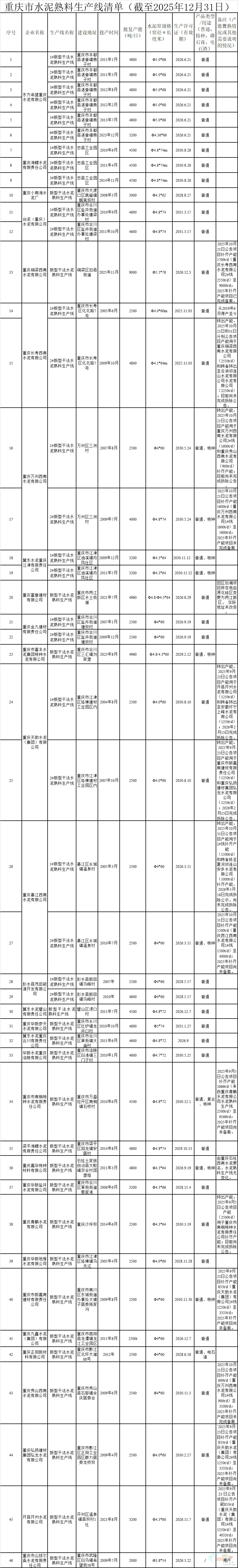 日前,重庆市经济和信息化委员会公示重庆市水泥熟料生产线清单更新情况。截至2025年12月31日,
