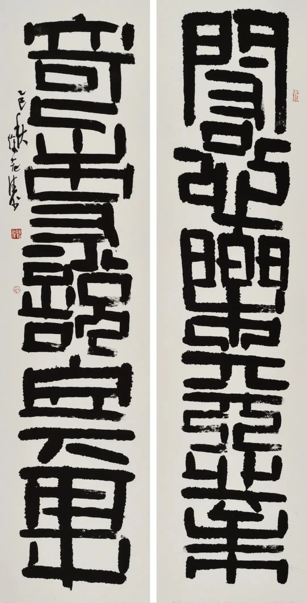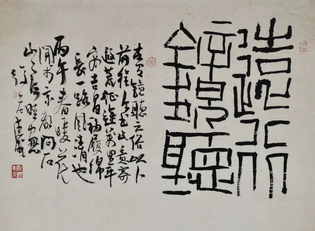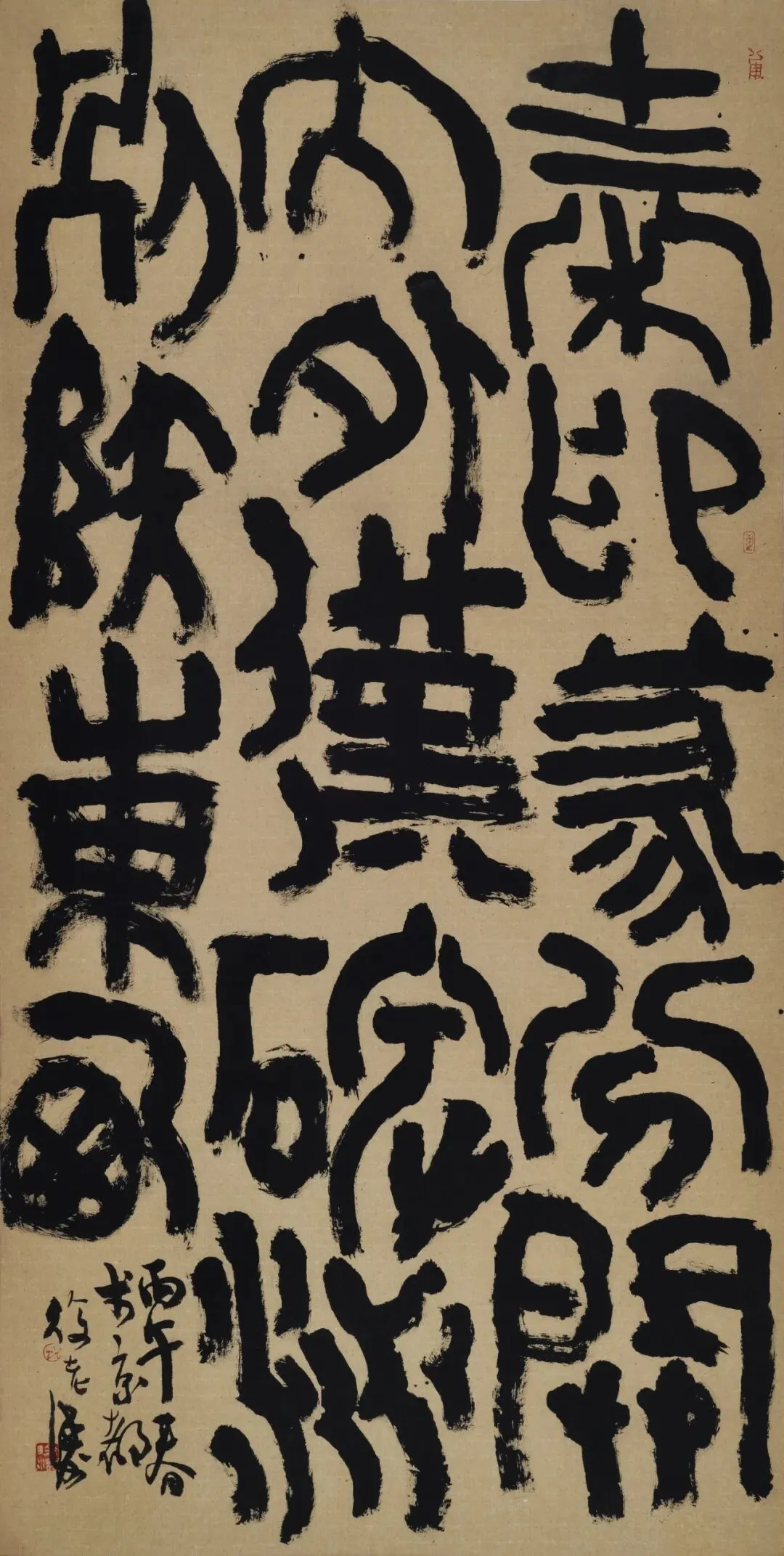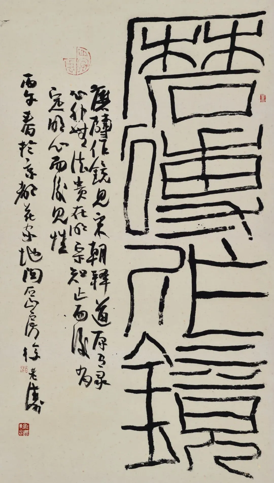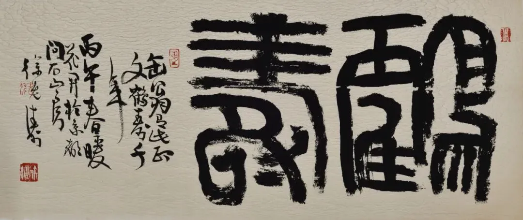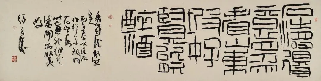 徐涛君的草书和金文均重线质力度和造型感,让人过目难忘。而我尤爱其小玺陶印,颇有战国印的奇崛和秦印的简约,盎然而其金石气和铸造味,与当代重笔意的流行印风大异其趣。印者之妙有异于书者,似不在飞动之拟意,而在凝重之造形。金石之用,起于庙堂,必以神秘庄严装饰精密为能事,所谓“印宗秦汉”亦此意也。邓完伯、吴让之出,以世俗感性而演绎,婀娜多姿有余,典雅函咏不足,致少古意也。我爱其印,数年前曾祈赐二斋馆印:泥龟梦蝶堂主、成都载天山人,今复观之,把玩良久,余味无尽矣。常言道:“士隔三日,当刮目相看。”徐涛君诚为此士也。近年他尤着力于大篆研习。焦黑浓重的墨线仿佛刻划进纸面,又像商周青铜器铭上那浮起的阳文线条,真是具有强烈的金属感和金石气。他以行草笔意参化金文大篆与汉篆殳书,雍容疏放,古奥奇曲,一如凸凹有致的印面文字,令人称奇。徐涛君之行草完成了从碑学向帖学的华丽转身。我曾见其临写的《唐人摹万岁通天帖》的王氏一门书,颇具东晋风度。而近期其行草,气息古雅内敛,潇洒从容,更获精进,毫无一点碑派书家在点线上的滞涩和造作。老话说,北人南相者有福。徐君生于北国,可称碑骨帖相之有福人,其书真可宝也!
