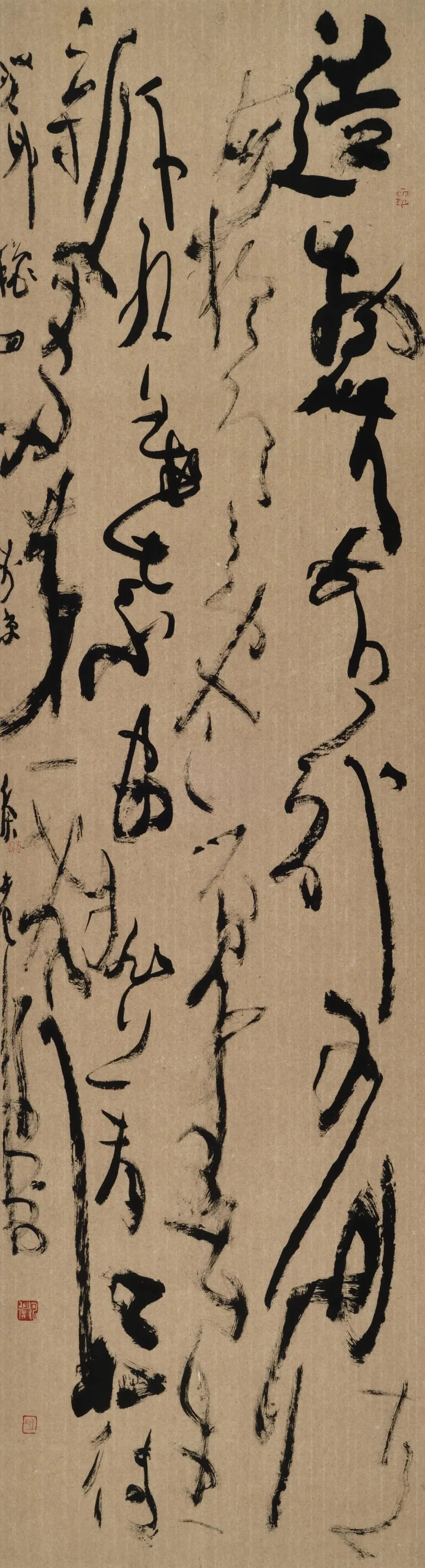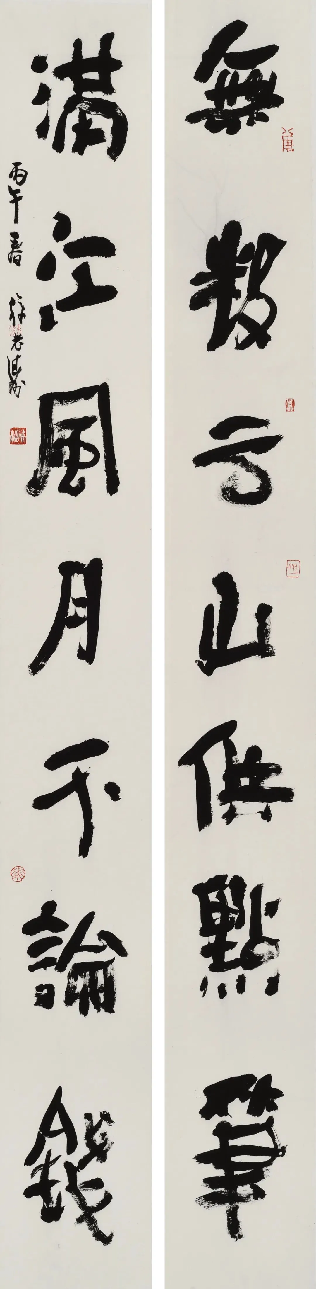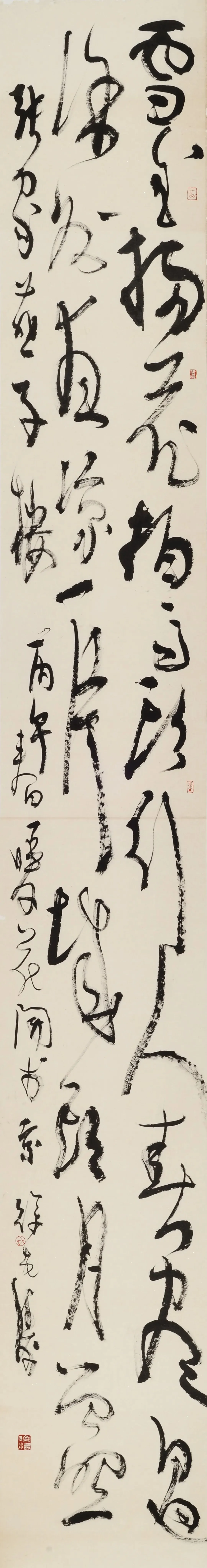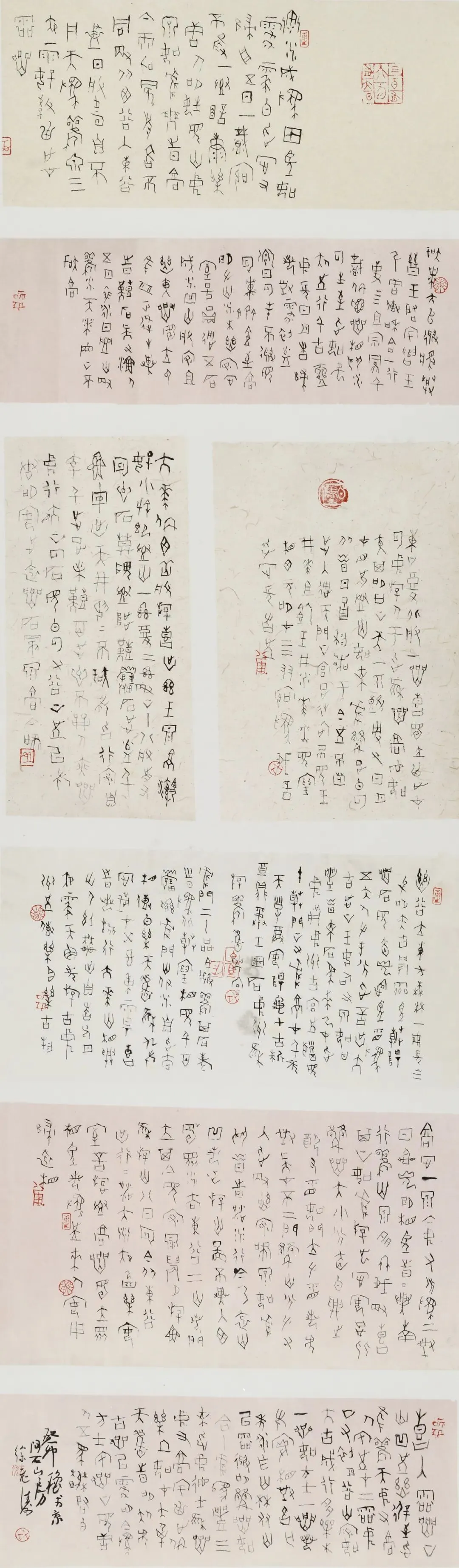 徐涛君的草书和金文均重线质力度和造型感,让人过目难忘。而我尤爱其小玺陶印,颇有战国印的奇崛和秦印的简约,盎然而其金石气和铸造味,与当代重笔意的流行印风大异其趣。印者之妙有异于书者,似不在飞动之拟意,而在凝重之造形。金石之用,起于庙堂,必以神秘庄严装饰精密为能事,所谓“印宗秦汉”亦此意也。邓完伯、吴让之出,以世俗感性而演绎,婀娜多姿有余,典雅函咏不足,致少古意也。我爱其印,数年前曾祈赐二斋馆印:泥龟梦蝶堂主、成都载天山人,今复观之,把玩良久,余味无尽矣。常言道:“士隔三日,当刮目相看。”徐涛君诚为此士也。近年他尤着力于大篆研习。焦黑浓重的墨线仿佛刻划进纸面,又像商周青铜器铭上那浮起的阳文线条,真是具有强烈的金属感和金石气。他以行草笔意参化金文大篆与汉篆殳书,雍容疏放,古奥奇曲,一如凸凹有致的印面文字,令人称奇。徐涛君之行草完成了从碑学向帖学的华丽转身。我曾见其临写的《唐人摹万岁通天帖》的王氏一门书,颇具东晋风度。而近期其行草,气息古雅内敛,潇洒从容,更获精进,毫无一点碑派书家在点线上的滞涩和造作。老话说,北人南相者有福。徐君生于北国,可称碑骨帖相之有福人,其书真可宝也!